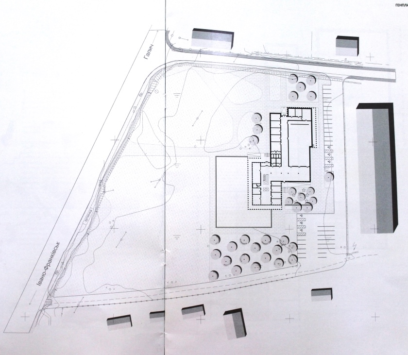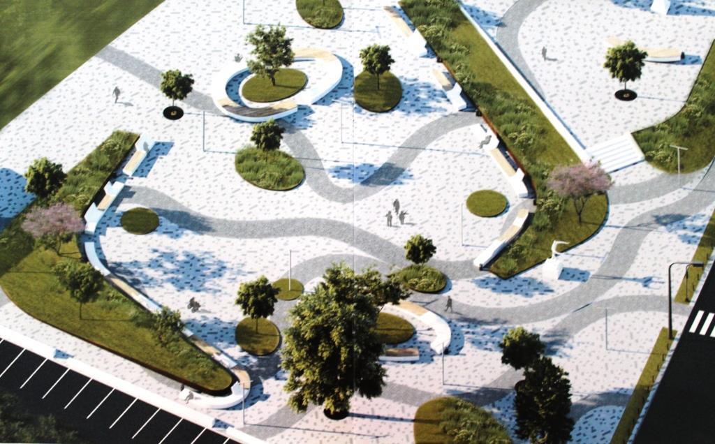 Передбачається створити дві смуги озеленення з квітниками та деревами, лавки та малі архітектурні форми, паркінг для авто тощо.
