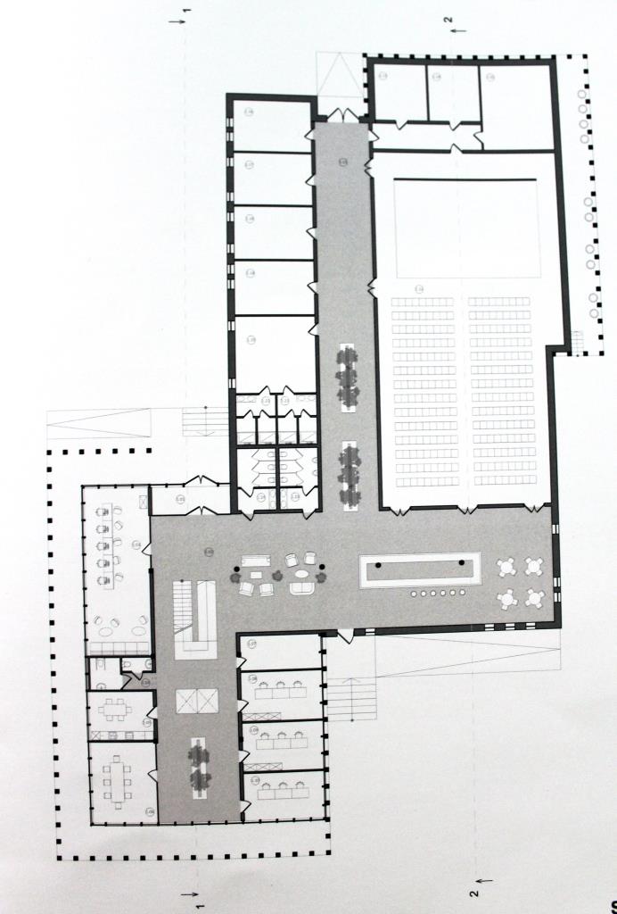 1) адміністративна частина – 2 поверхи, ЦНАП (53,51 м.кв.), кабінети та відділи (208,24 м.кв.), 2 конференц-зали (80,62 м.кв.), допоміжні приміщення (134,87 м.кв.);