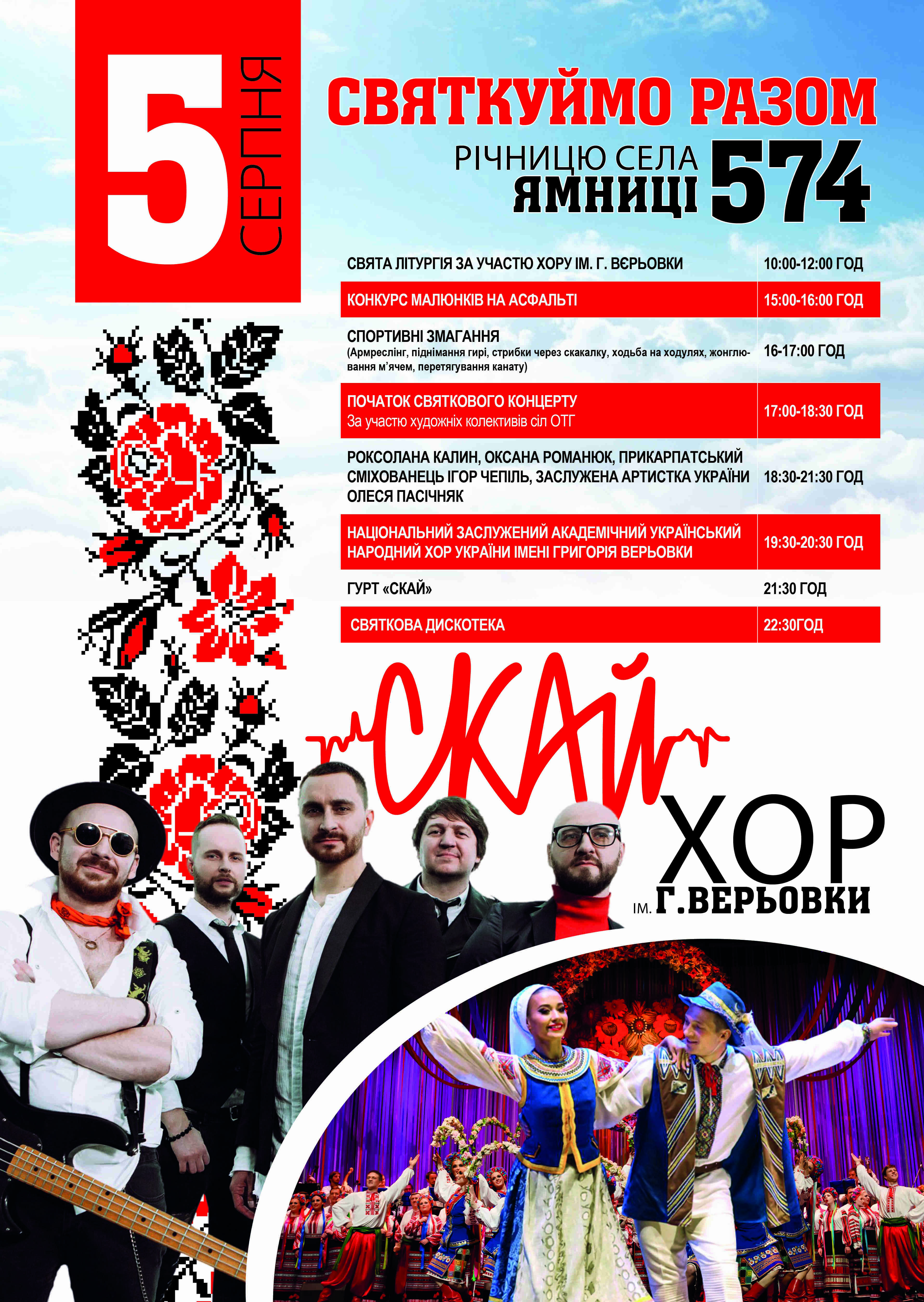 ЗАПРОШУЄМО НА СВЯТКУВАННЯ ДНЯ СЕЛА ЯМНИЦЯ 30.07.201807.08.2018 4733 У неділю 5 серпня с. Ямниця святкуватиме свою 574-ту річницю. Запрошуємо!