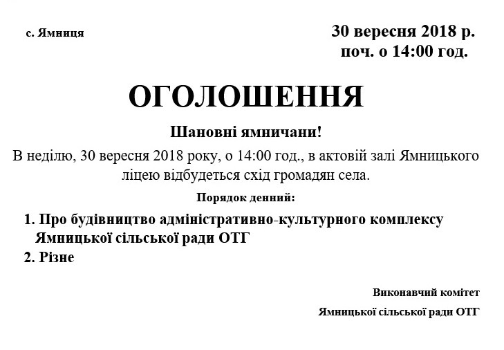 ДО УВАГИ ЯМНИЧАН! ВІДБУДЕТЬСЯ СХІД ГРОМАДЯН СЕЛА