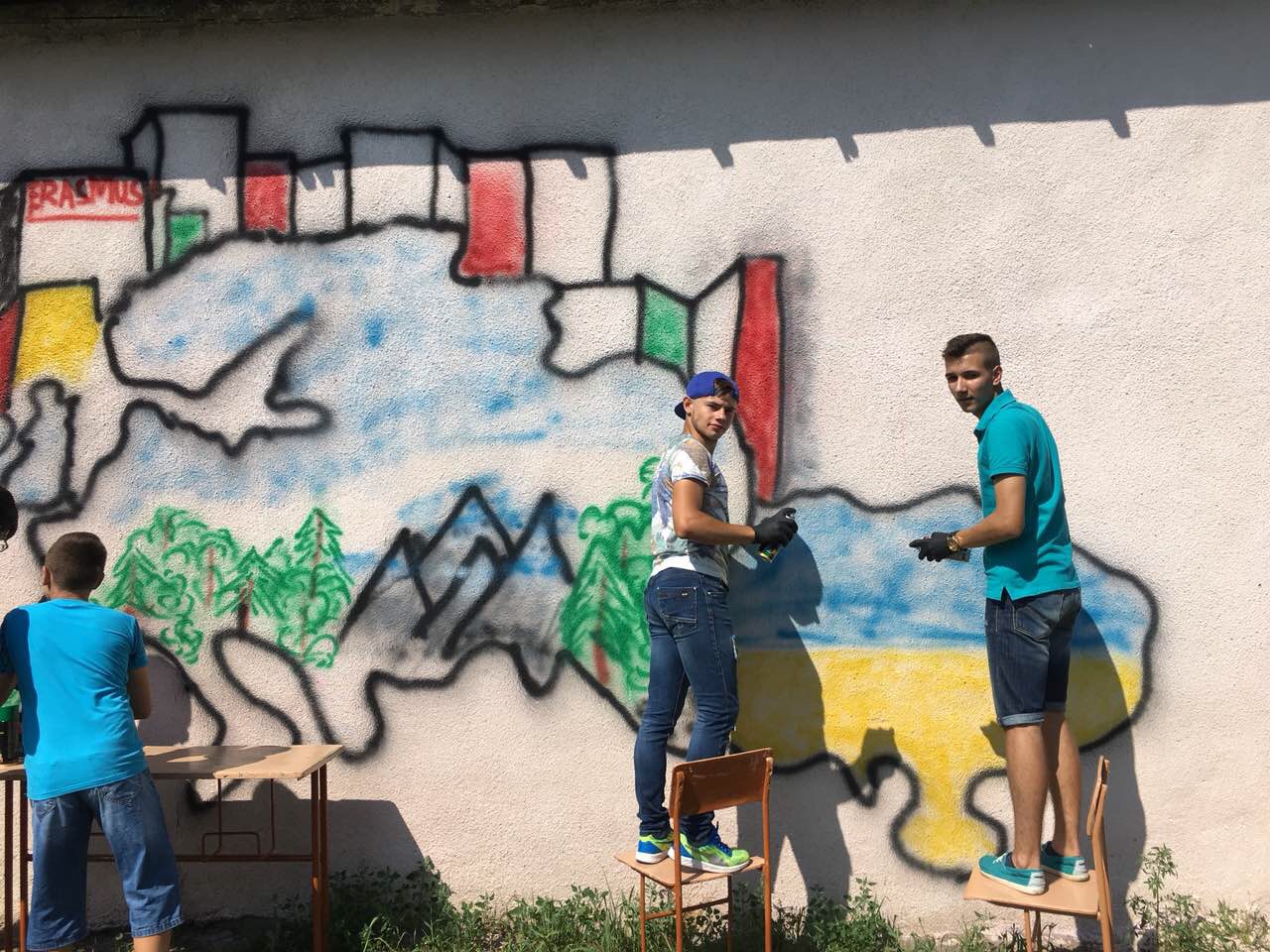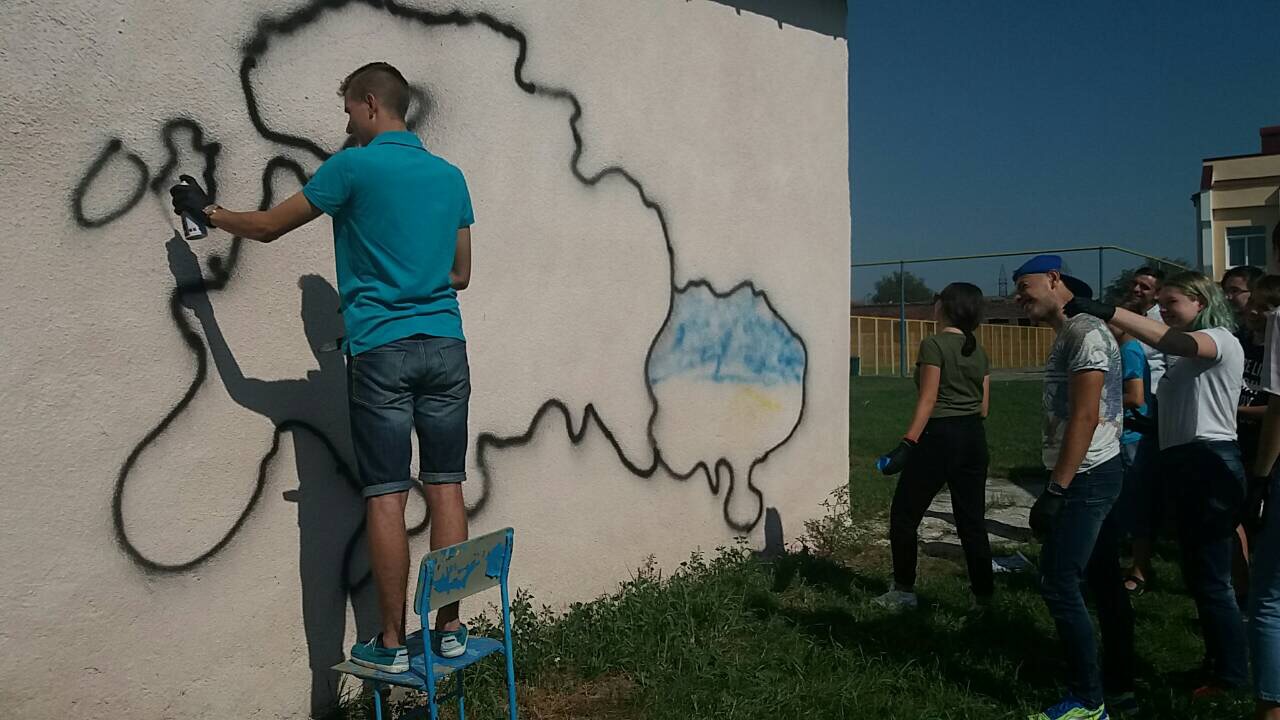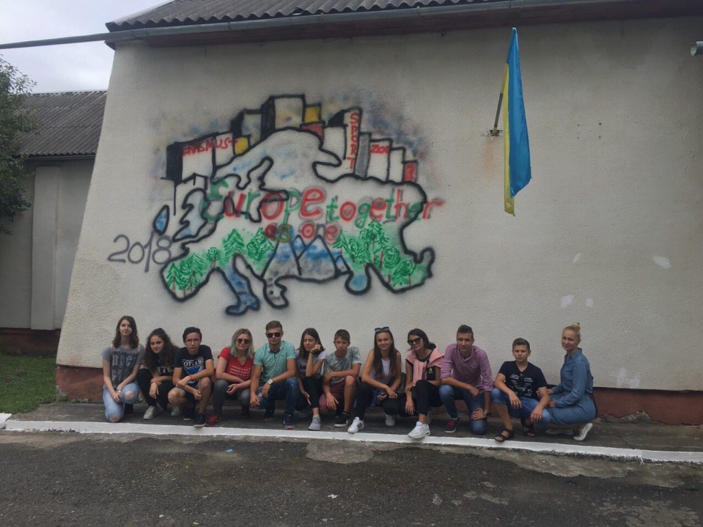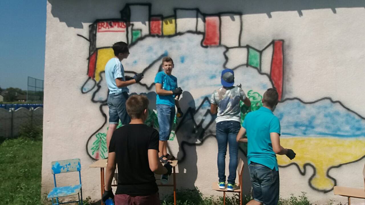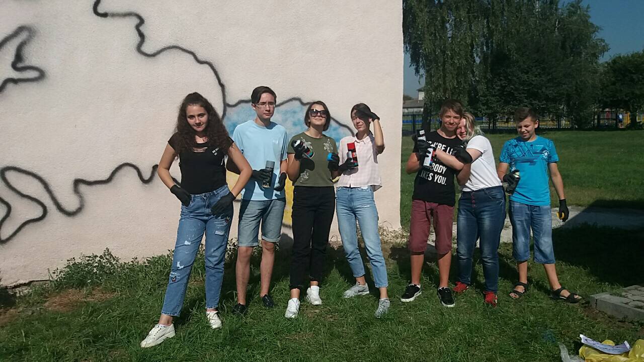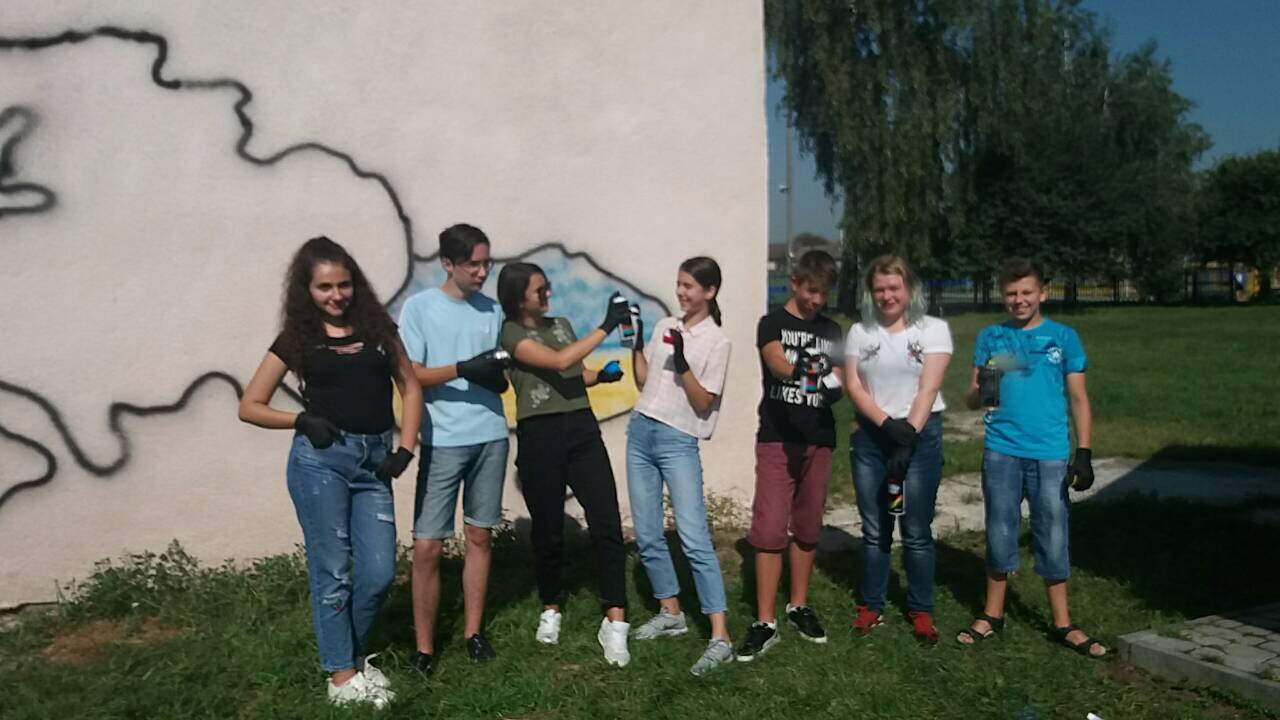 Тож, наші діти з великим ентузіазмом прагнули втілити часточку проекту. І завдяки співпраці з місцевою владою ОТГ та районною адміністрацією було обрано місце. Не одне, а два. Перше – на одній з будівель Ямницького ліцею. Друге – на будівлі Тисменицької ДЮСШ. Малювали всі і все (звичайно, відповідно до ескізу).