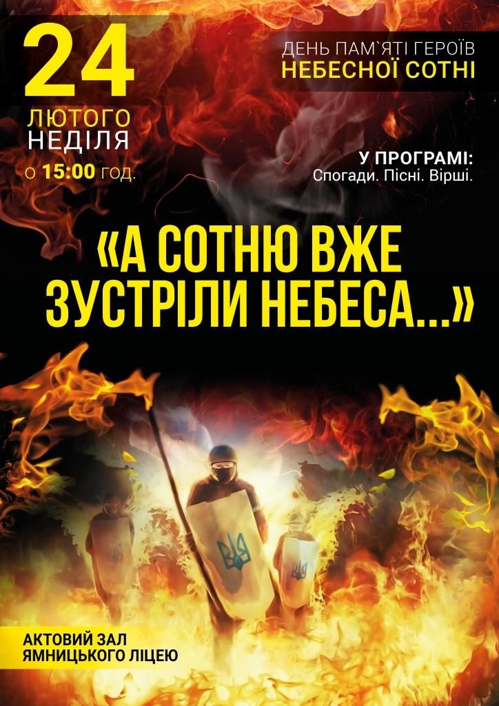 У неділю, 24 лютого 2019 року в актовій залі Ямницького ліцею відбудеться захід “А Сотню вже зустріли небеса…”, присвячений пам’яті героїв Небесної сотні та п’ятій річниці кривавих подій Майдану. У програмі: спогади, пісні, вірші. Початок о 15:00 год. Запрошуємо.