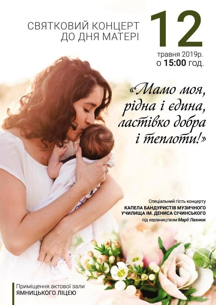 У неділю, 12 травня 2019 року в актовій залі Ямницького ліцею відбудеться святковий концерт до Дня матері під назвою “Мамо моя, рідна і єдина, ластівко добра і теплоти!” Початок о 15:00 год.