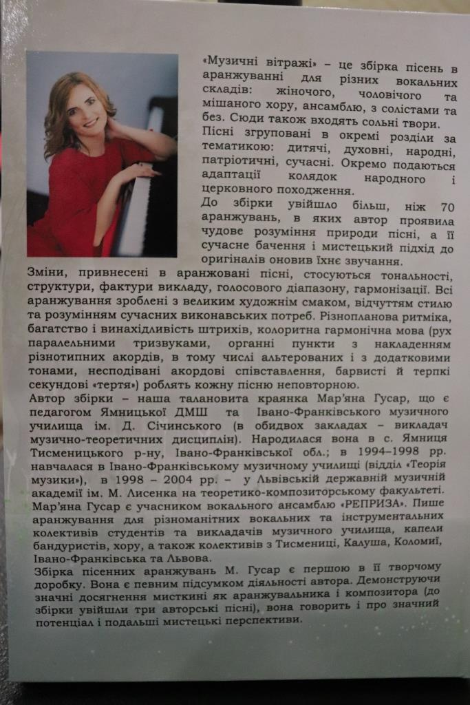 – До книги “Музичні вітражі” увійшли твори навіть 10-річної давності, а саму збірку готувала близько року, редагувала, оформляла, збирала в одне ціле, набирала на комп’ютері ноти, тому що дуже багато творів були писані вручну. Саме це найбільше часу і забирало. Здавалось, що твір придумати легше, ніж його набрати на комп’ютері і оформити як слід… А поки збірка була в друці, тобто від травня 2019 р., було написано вже дуже багато нових творів. У мене є мрія – видати збірку вокальних композицій для дитячих ансамблів і хорів з фортепіанним супроводом. Ще маю близько 20 творів для капели бандуристів (обожнюю писати і для бандури), з яких також планую створити збірку… Тому, планую не зупинятись і проводжувати працювати далі над аранжуванням пісень.