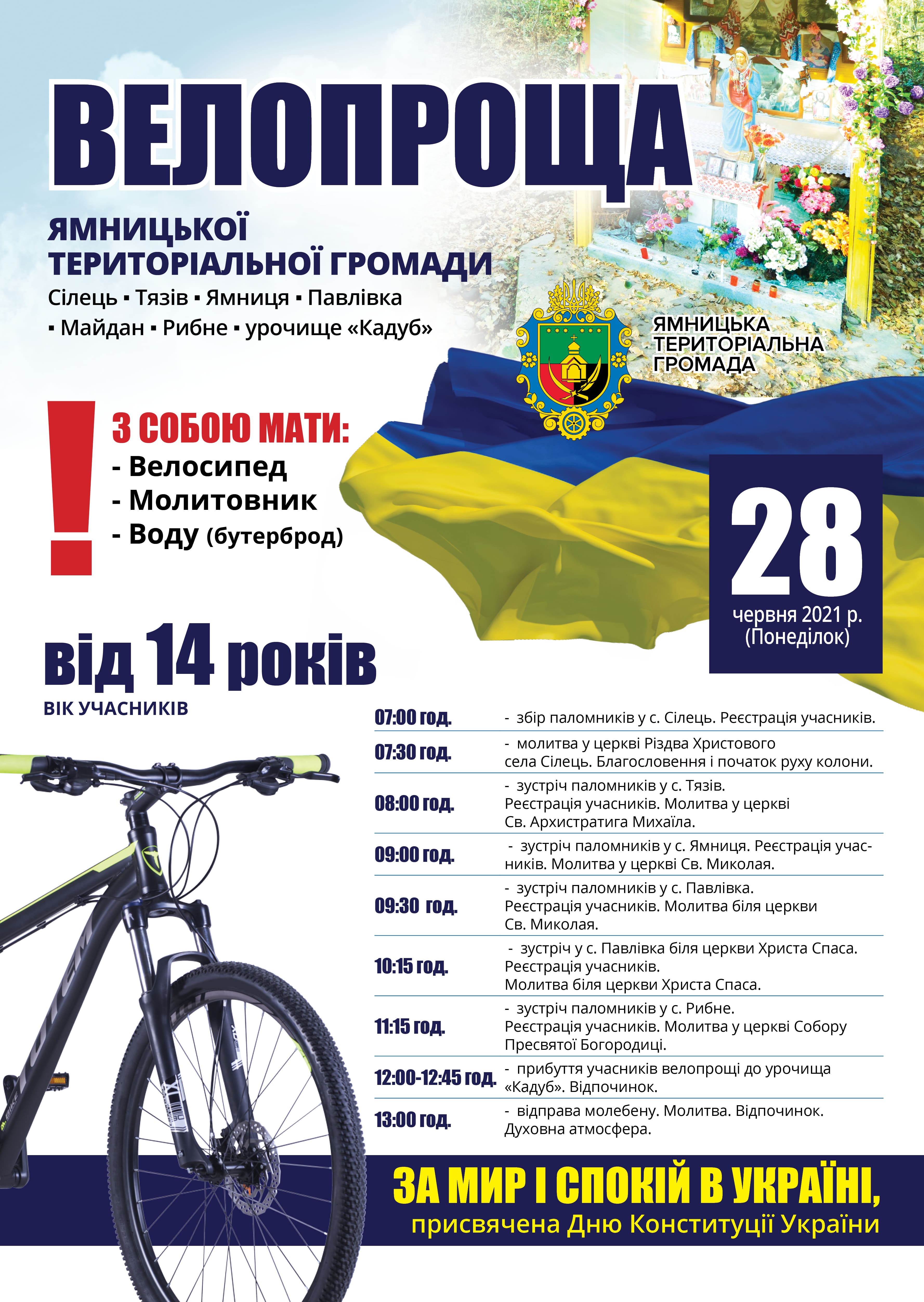 У понеділок, 28 червня 2021 року в Ямницькій територіальній громаді відбудеться велопроща до святого місця поблизу с. Рибне, урочища “Кадуб”, під гаслом “За мир і спокій в Україні”, присвячена Дню Конституції нашої Держави.