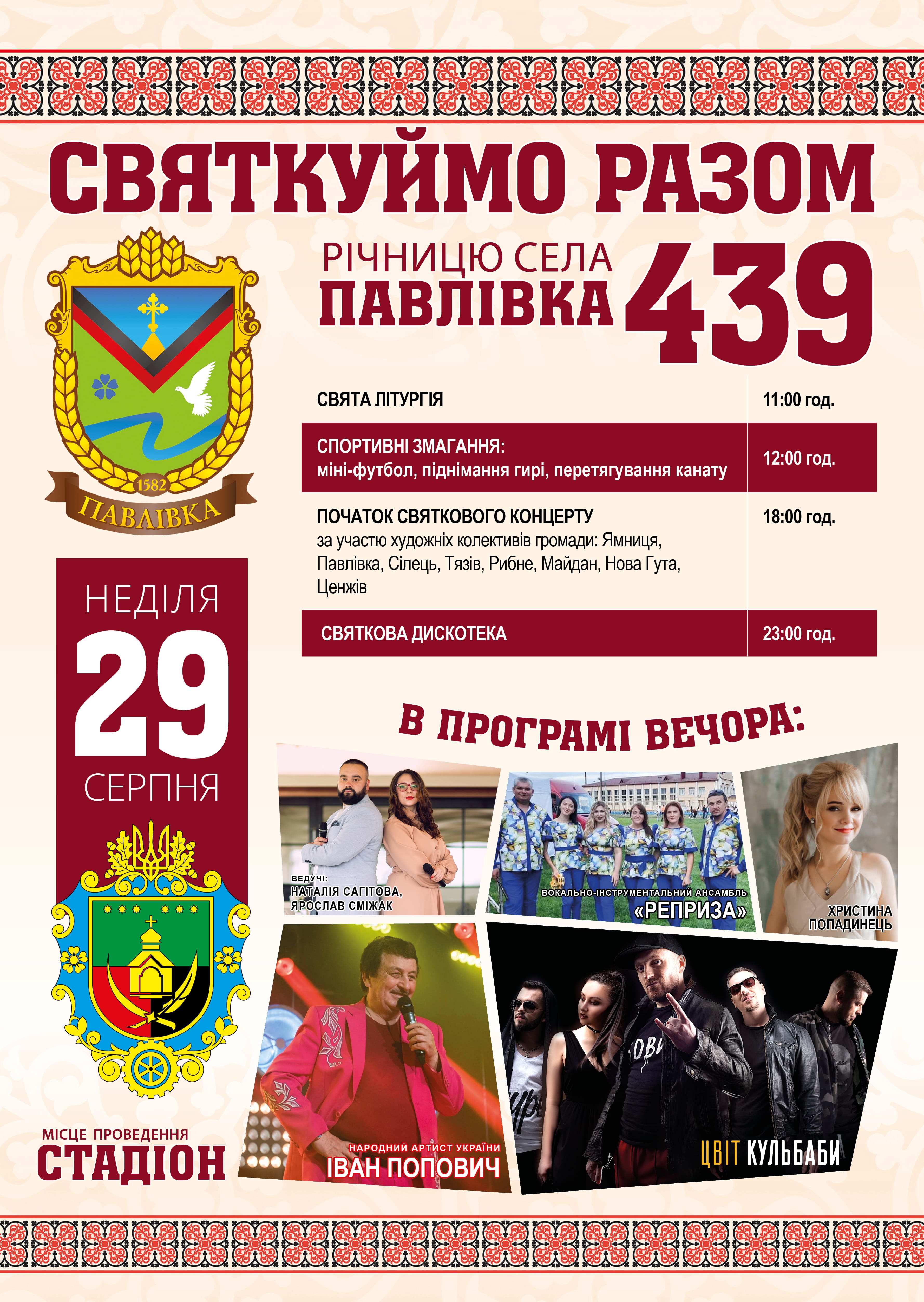 ЗАПРОШУЄМО НА СВЯТКУВАННЯ 439-Ї РІЧНИЦІ СЕЛА ПАВЛІВКА