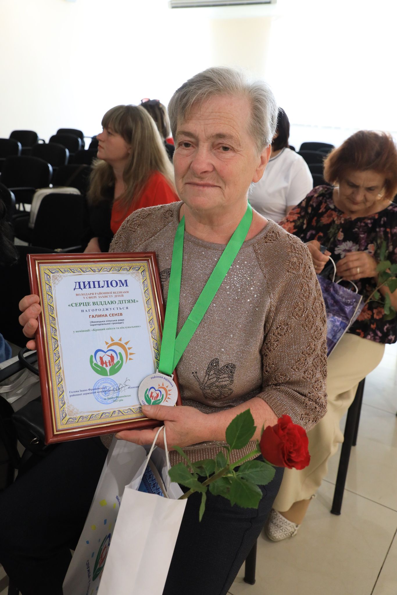 Крім того, напередодні відзначення Міжнародного Дня захисту дітей, в Івано-Франківську відбулася урочиста церемонія вручення районної відзнаки у сфері захисту дітей “Серце віддаю дітям”. Зокрема, представниця від Ямницької територіальної громади, мешканка с. Павлівка Галина Сенів отримала нагороду у номінації “Кращий опікун, піклувальник” за багаторічну сумлінну працю, відданість справі охорони дитинства, соціальну відповідальність та добросовісне виконання обов’язків піклувальника. Нагороду вручили заступниця голови ОВА Людмила Сірко та голова Івано-Франківської РВА Олександр Ярощук.