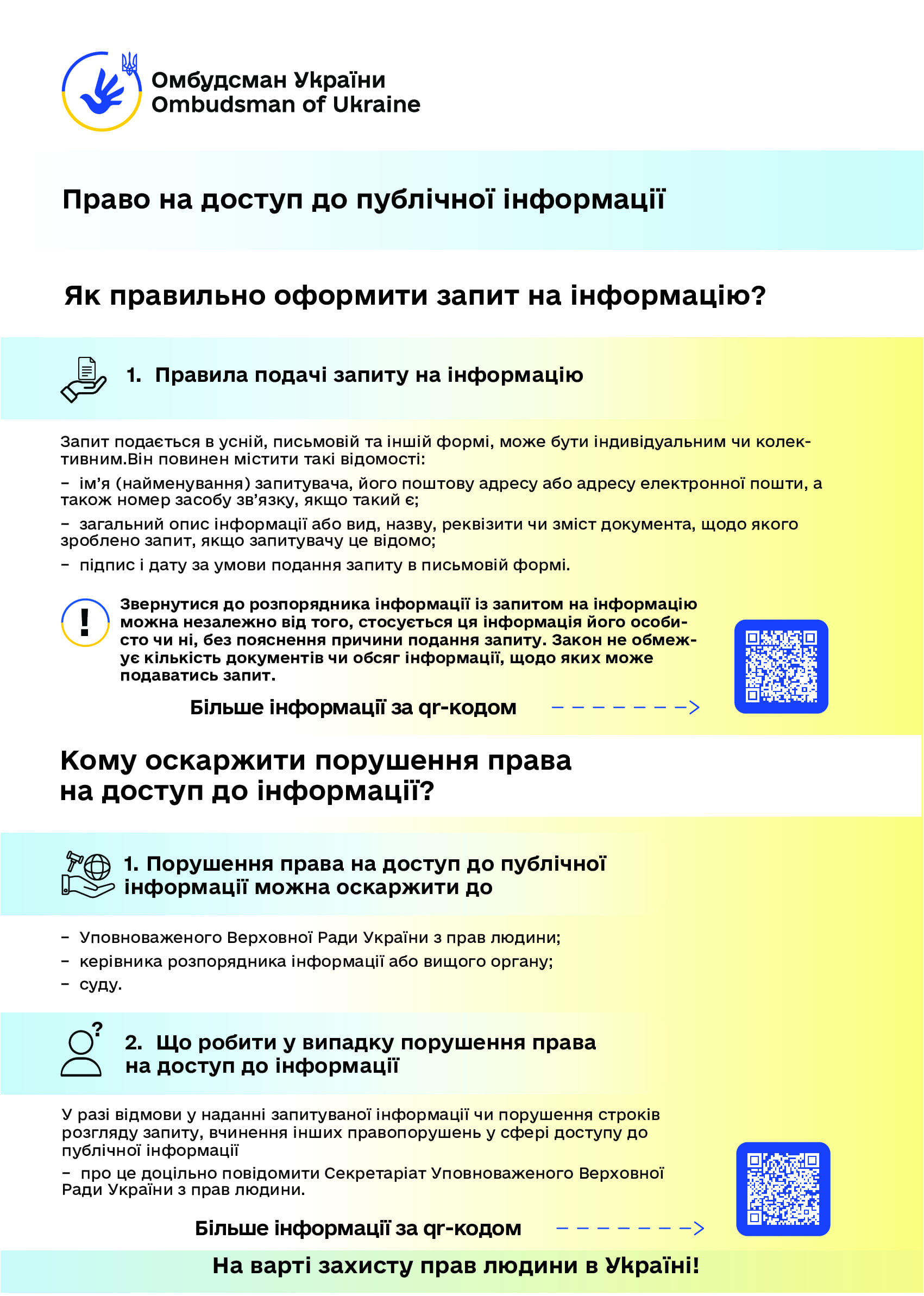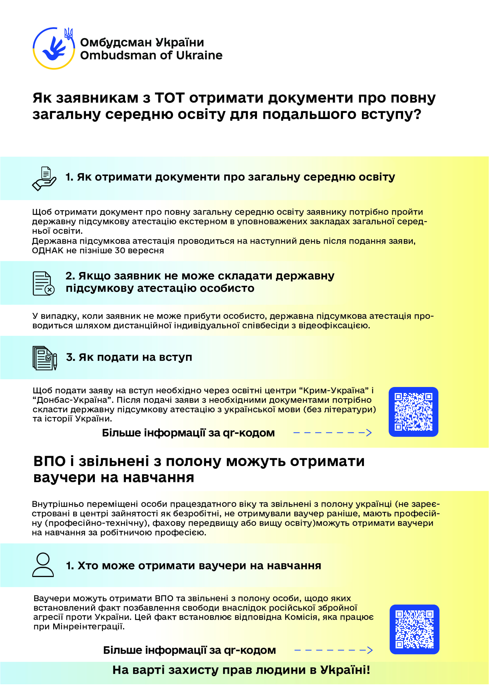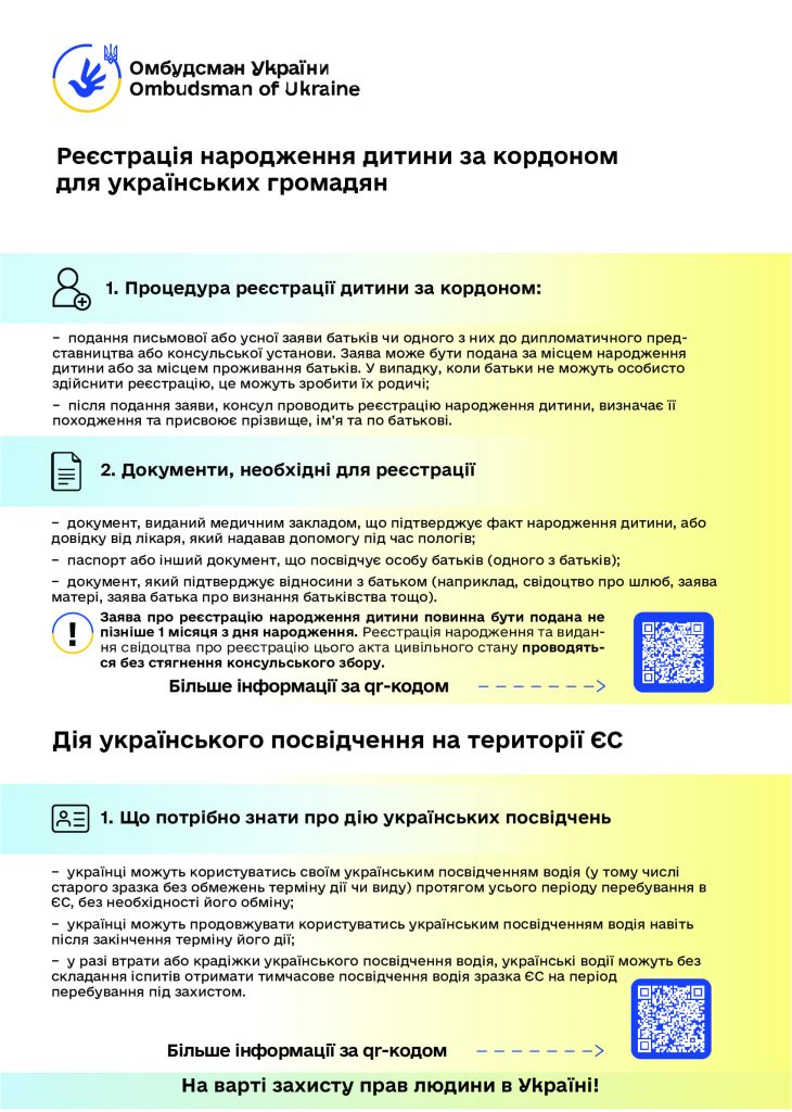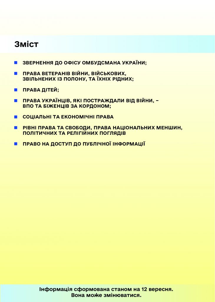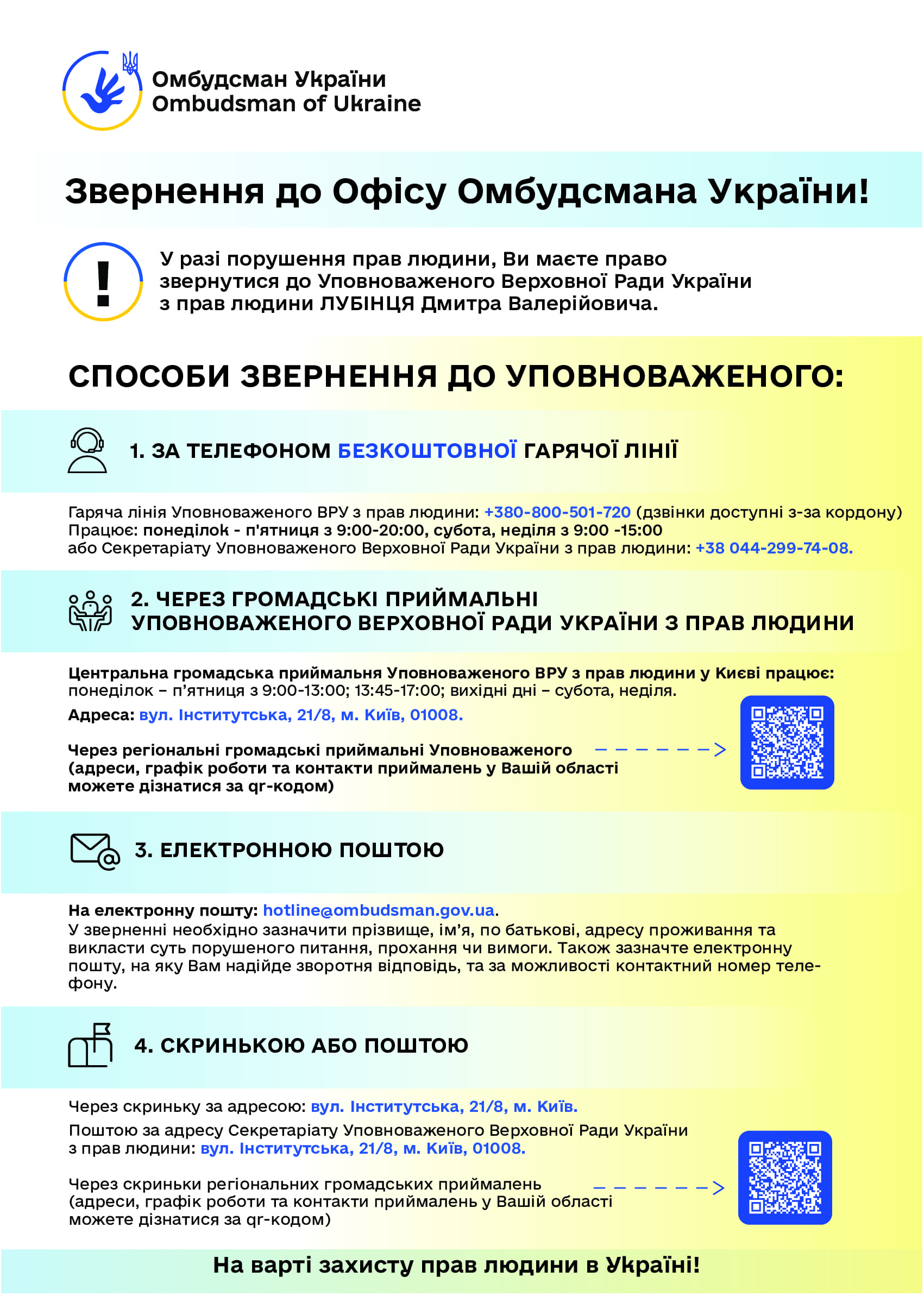 Керуючись статтею 22 Закону України “Про Уповноваженого Верховної Ради України з прав людини”, пропонуємо інформаційні матеріали (роз’яснення та графіки) Уповноваженого Верховної Ради України з прав людини з таких питань:
