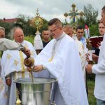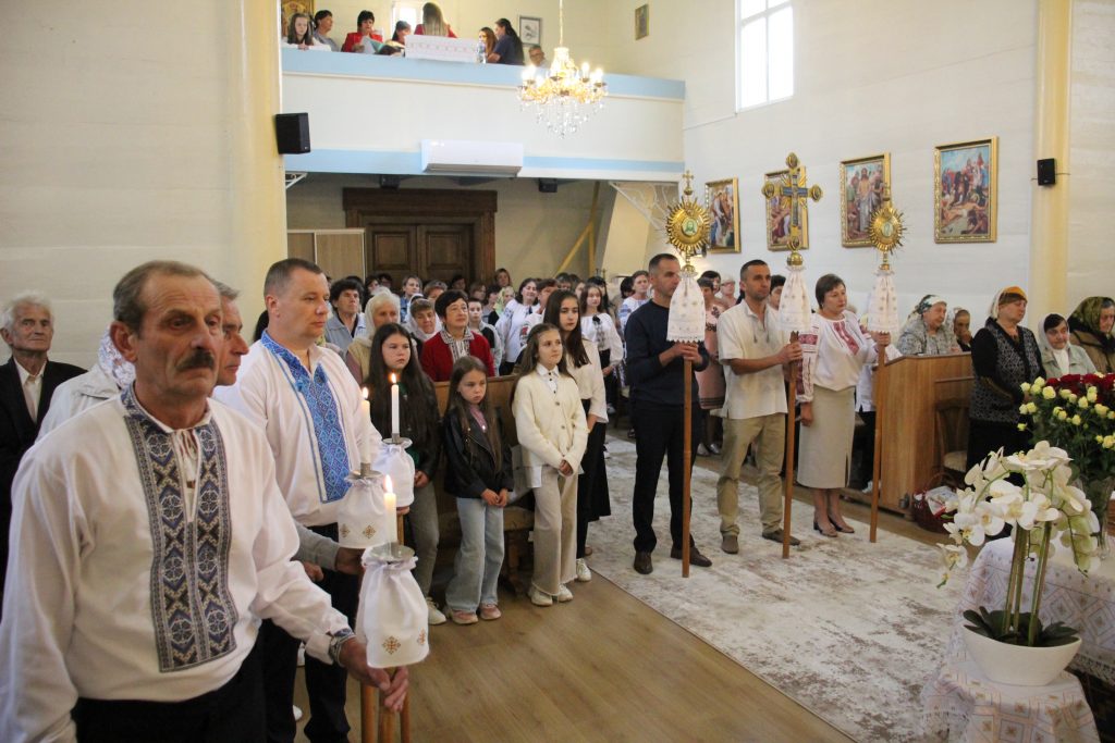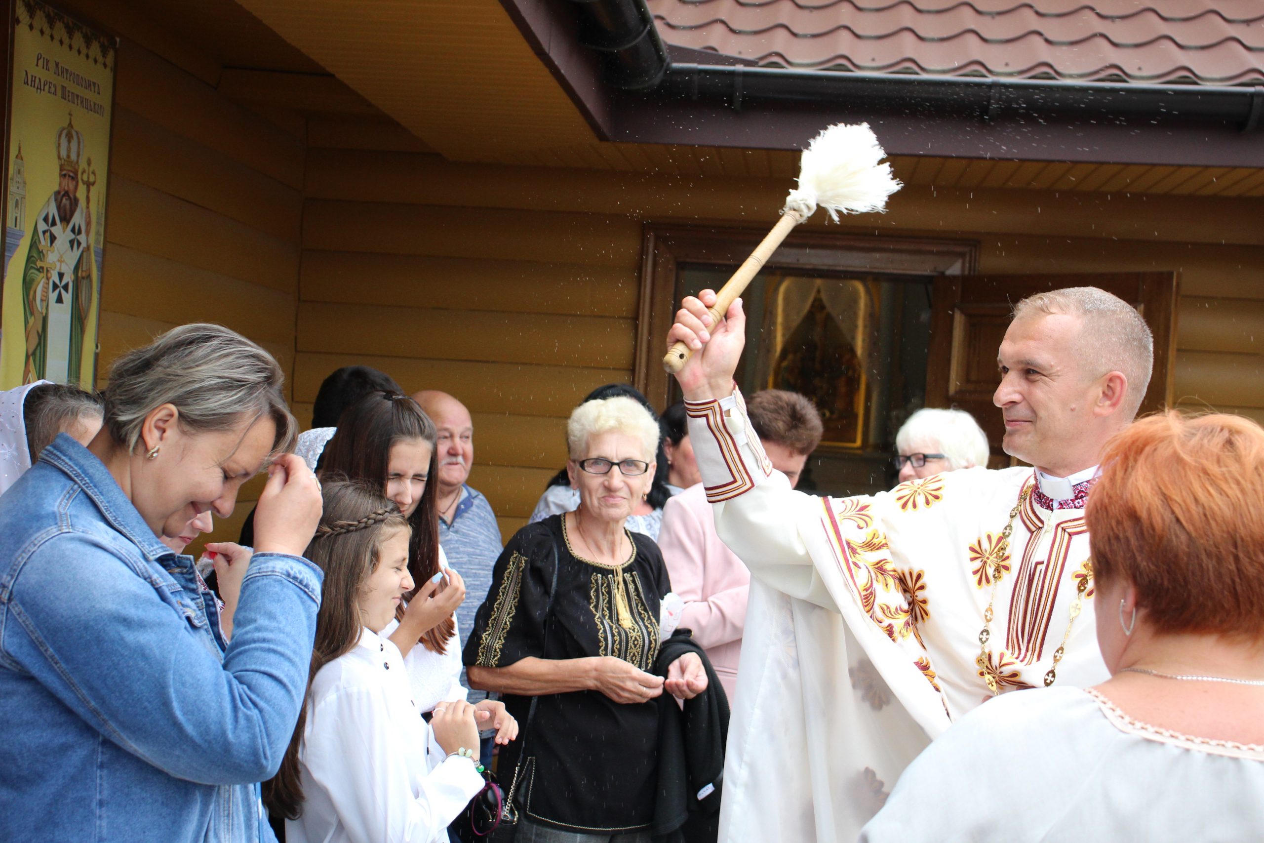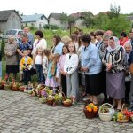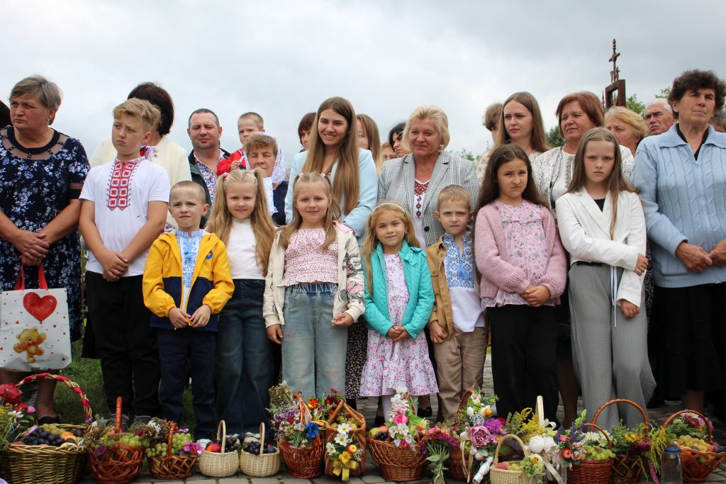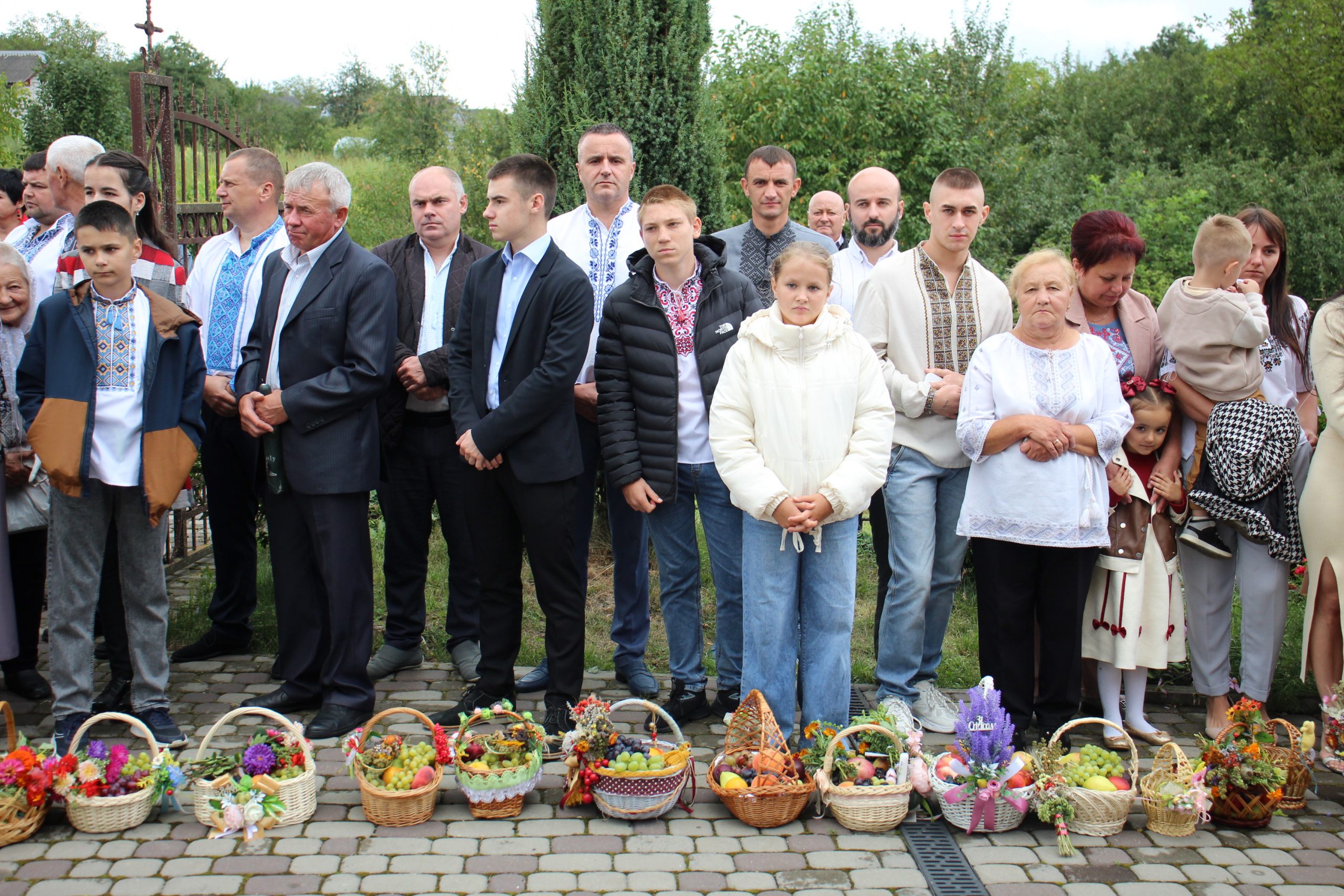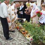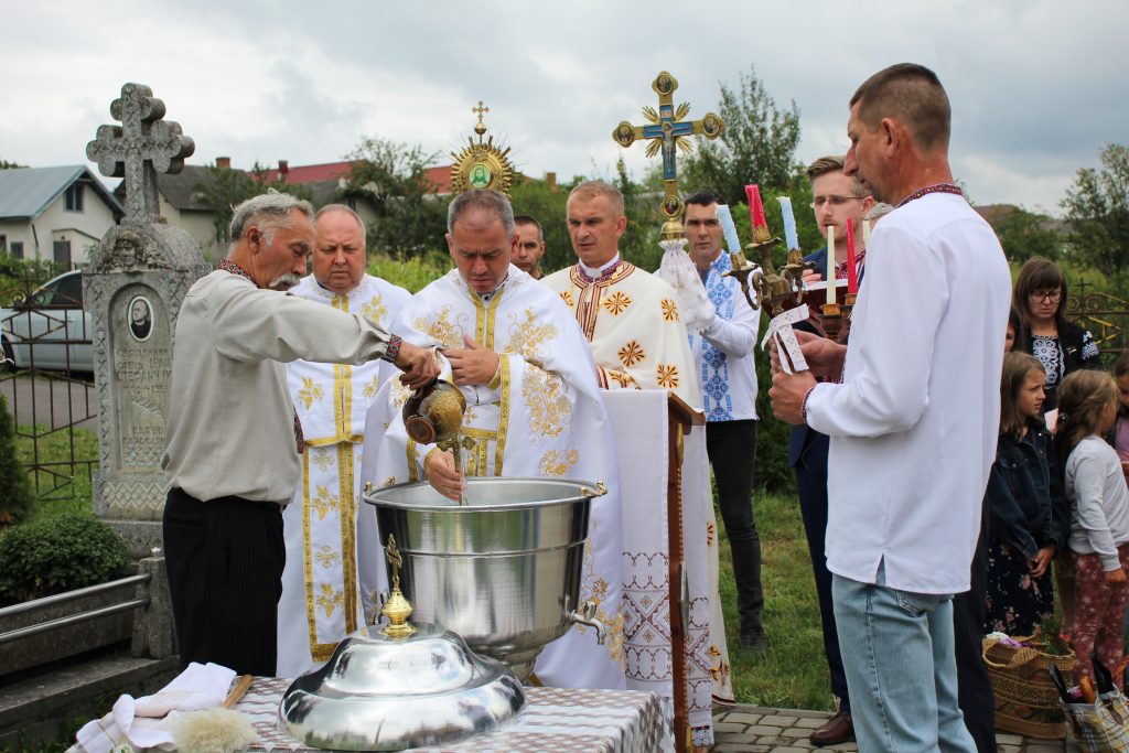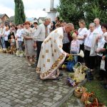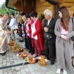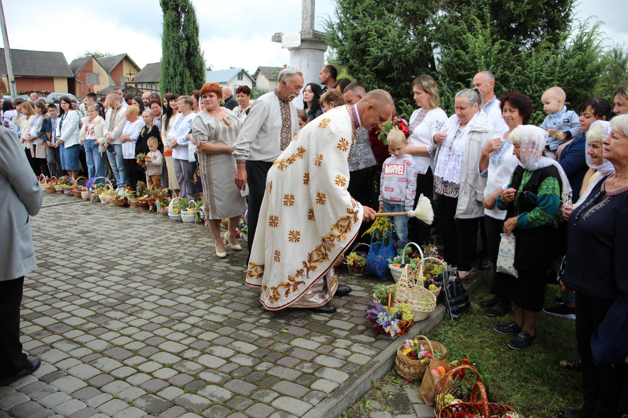 На завершення релігійна громада вишикувалася до урочистого мирування, а відтак вийшла на церковне подвір’я, де відбулося освячення води та окроплення нею святкових кошиків з плодами.