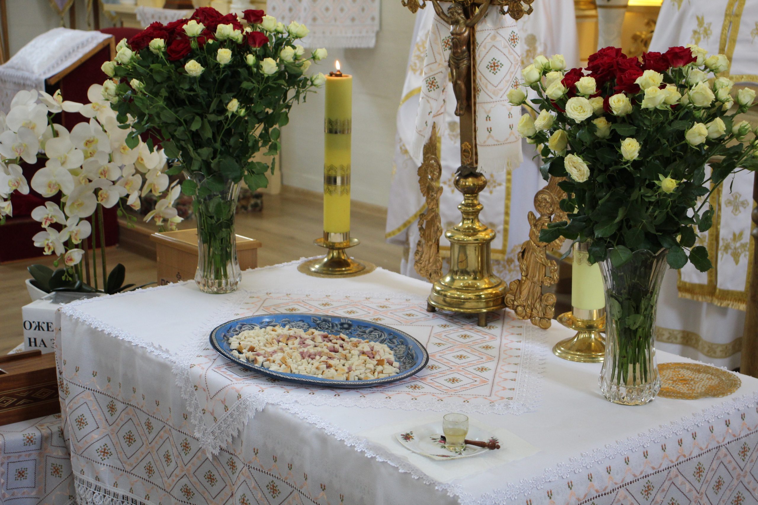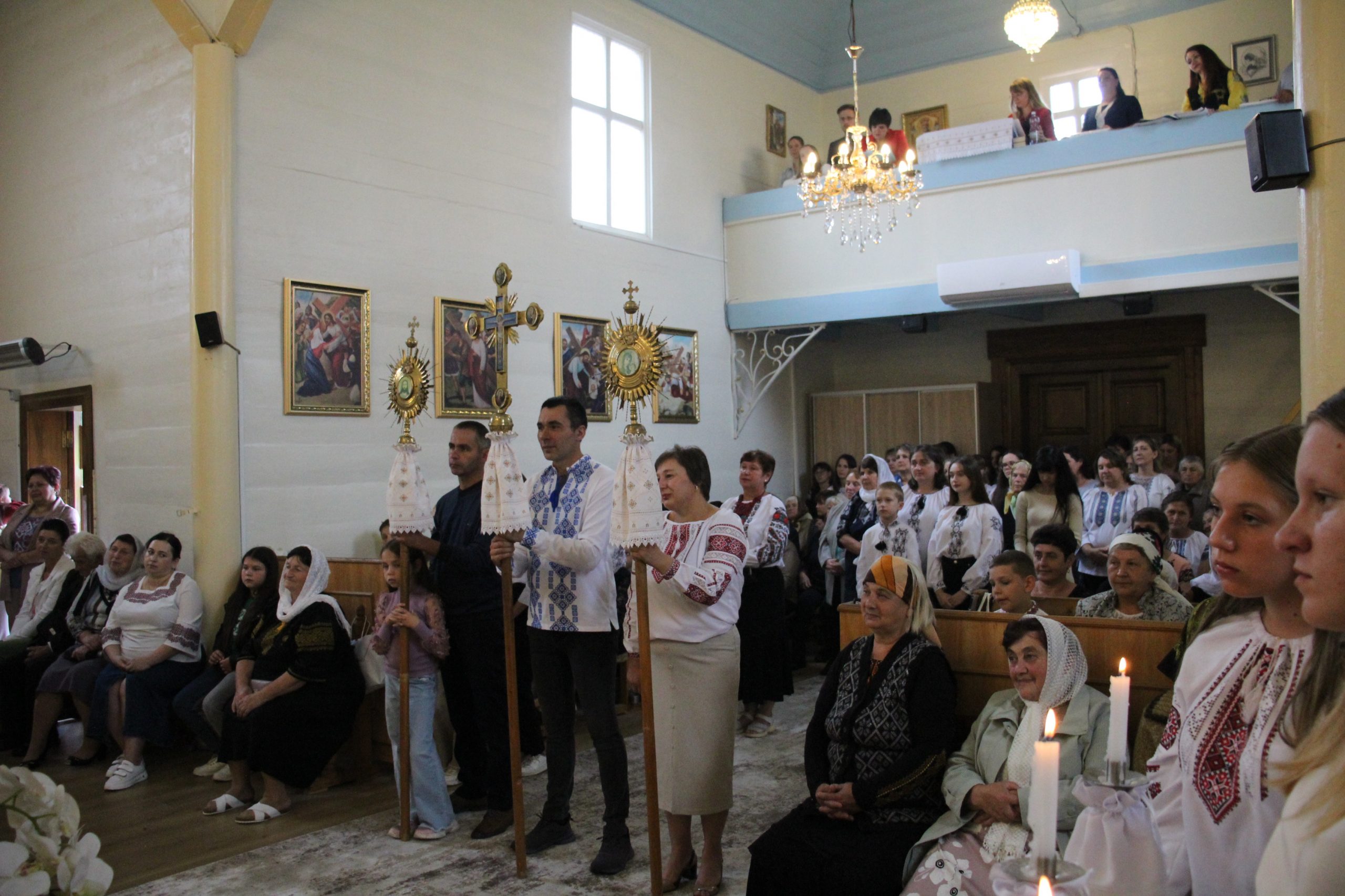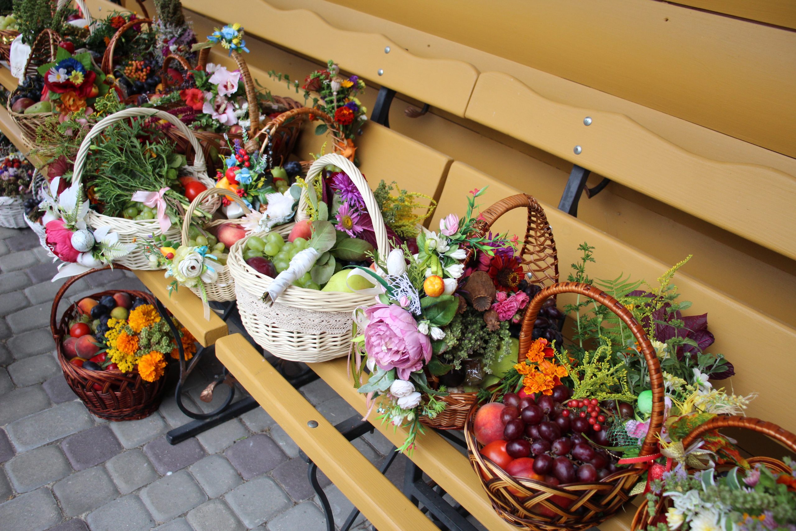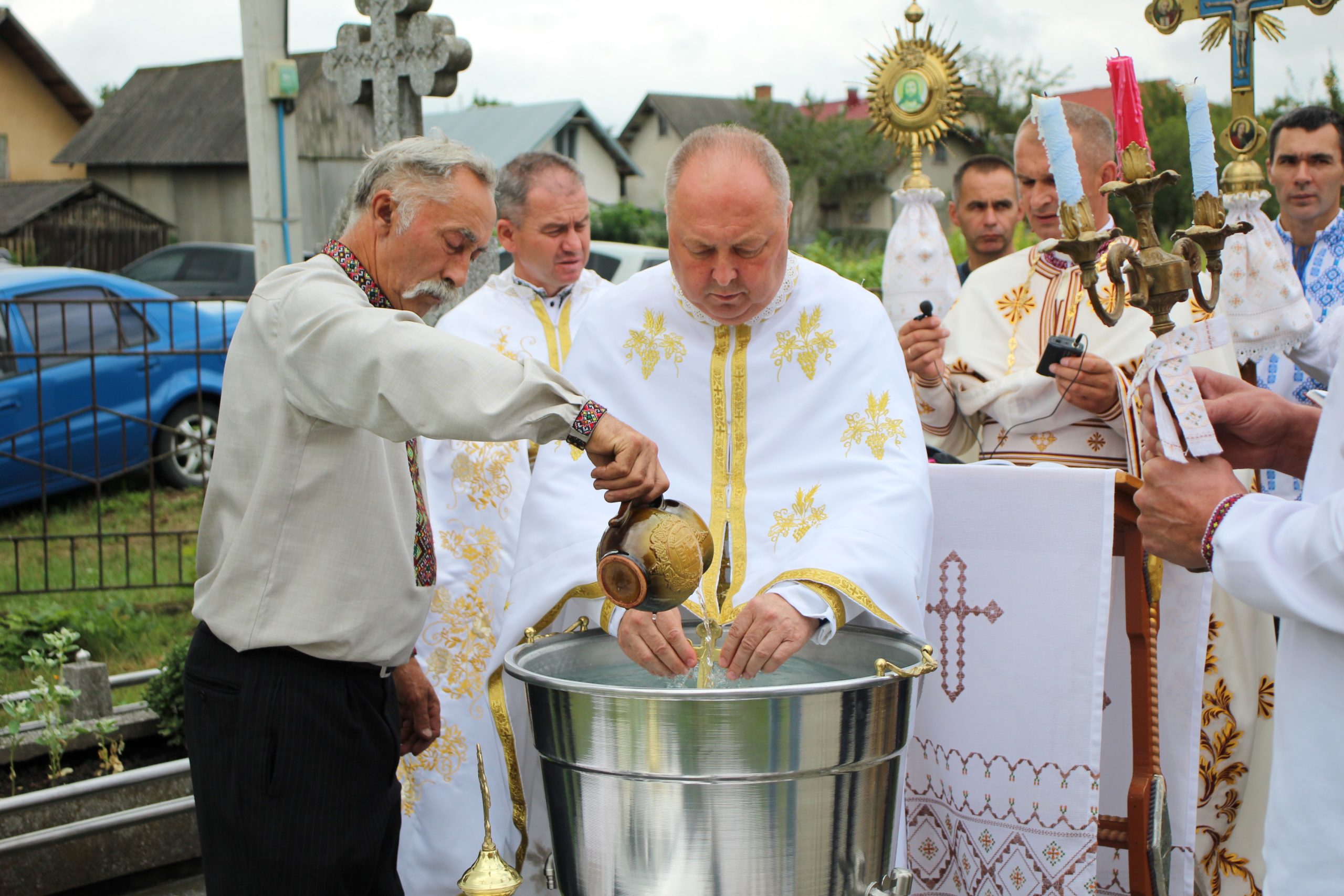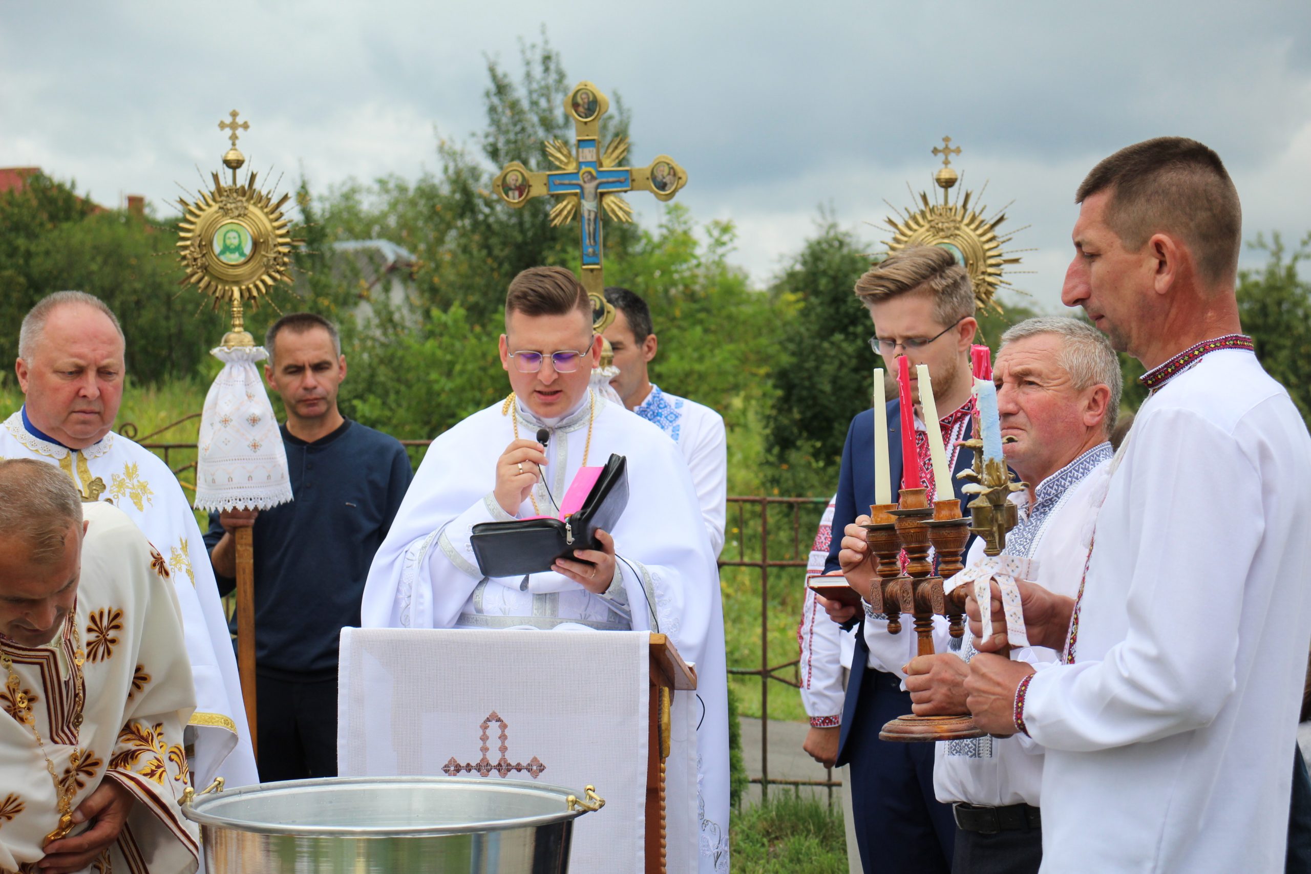 На завершення релігійна громада вишикувалася до урочистого мирування, а відтак вийшла на церковне подвір’я, де відбулося освячення води та окроплення нею святкових кошиків з плодами.