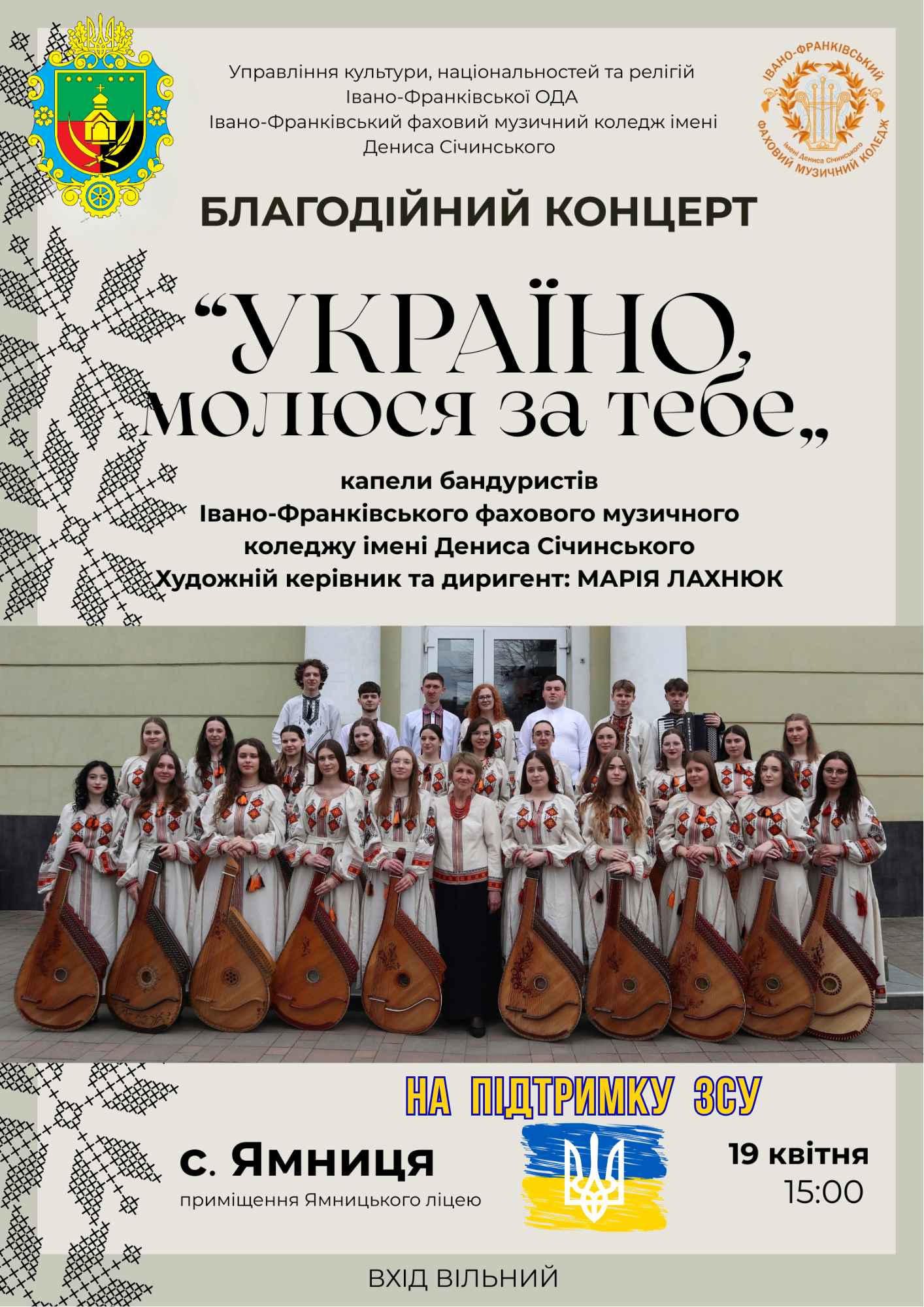 У неділю, 19 квітня 2026 р., в актовій залі Ямницького ліцею відбудеться благодійний захід “Україно, молюся за тебе” на підтримку ЗСУ, за участю капели бандуристів Івано-Франківського фахового музичного коледжу ім. Дениса Січинського.